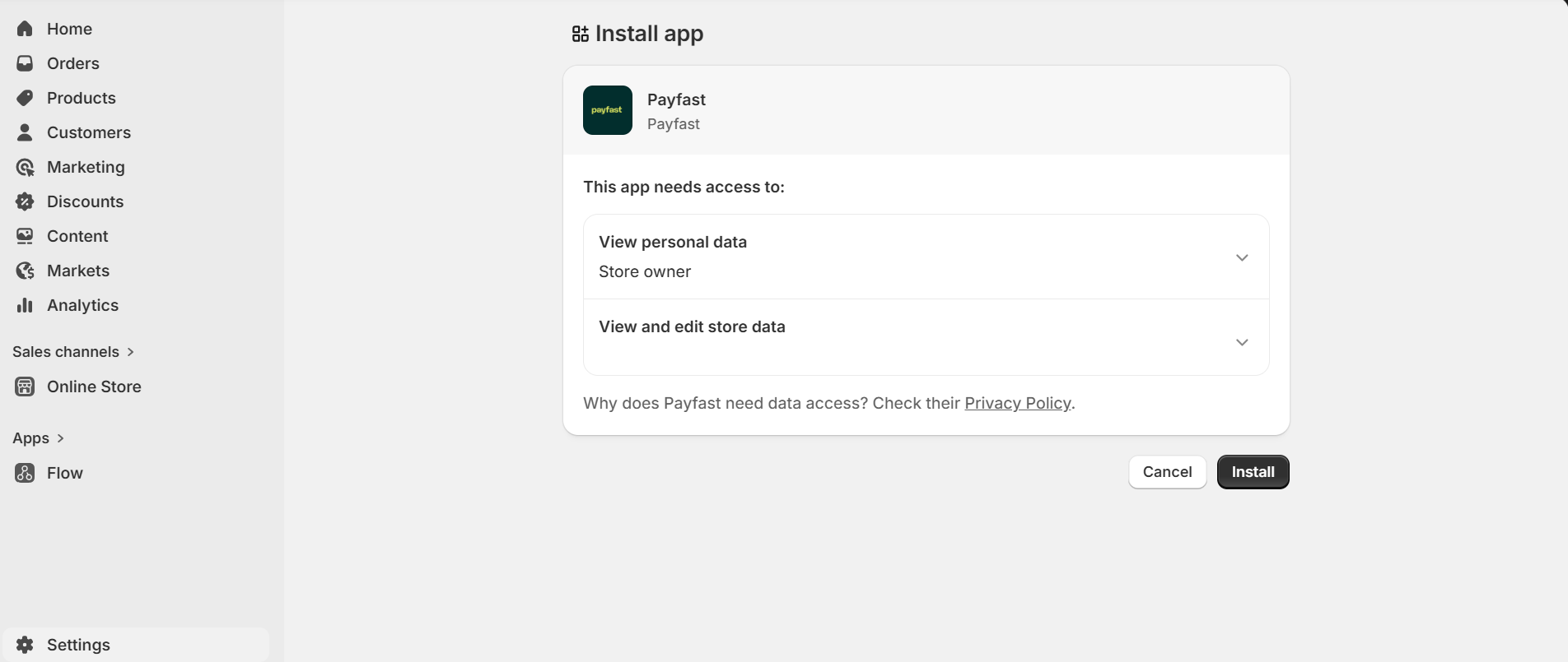 - You'll be taken to the PayFast Shopify installation page.
